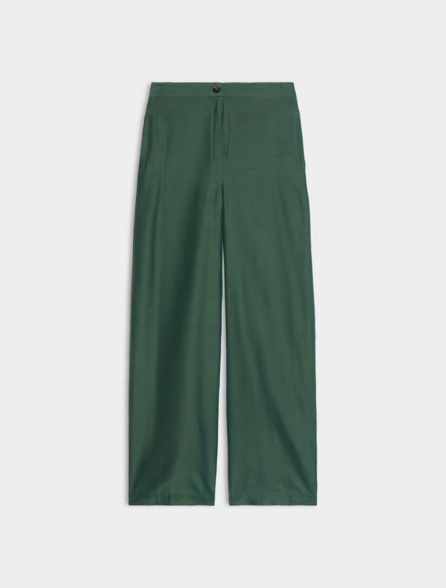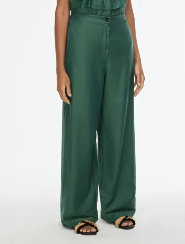 Spodnie delikatne z muślinu z jedwabiem i bawełną w pięknym kolorze butelkowej zieleni.