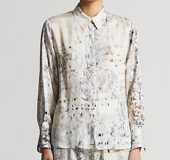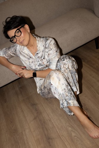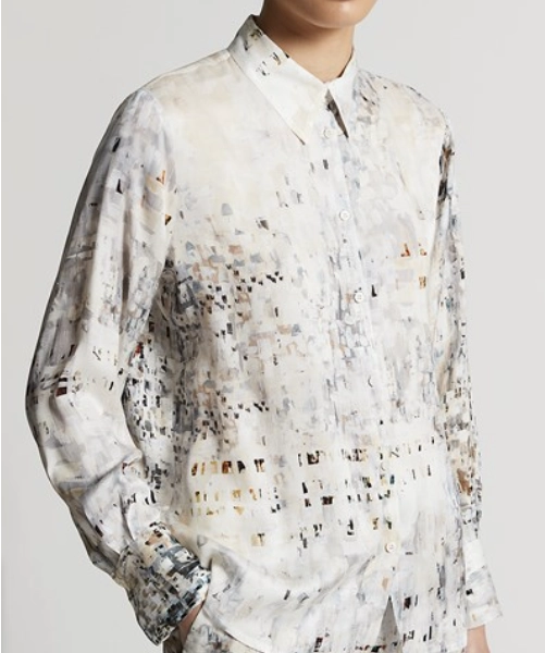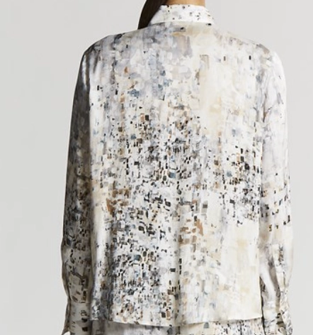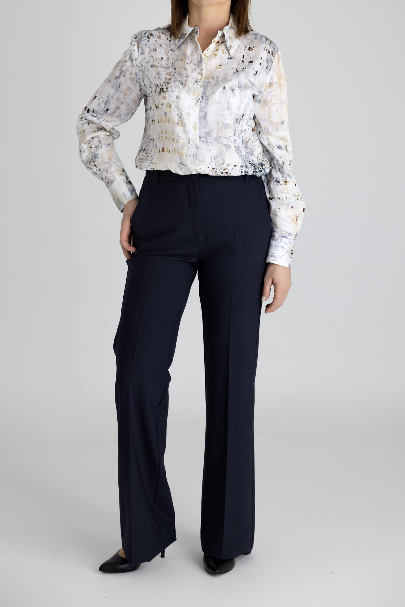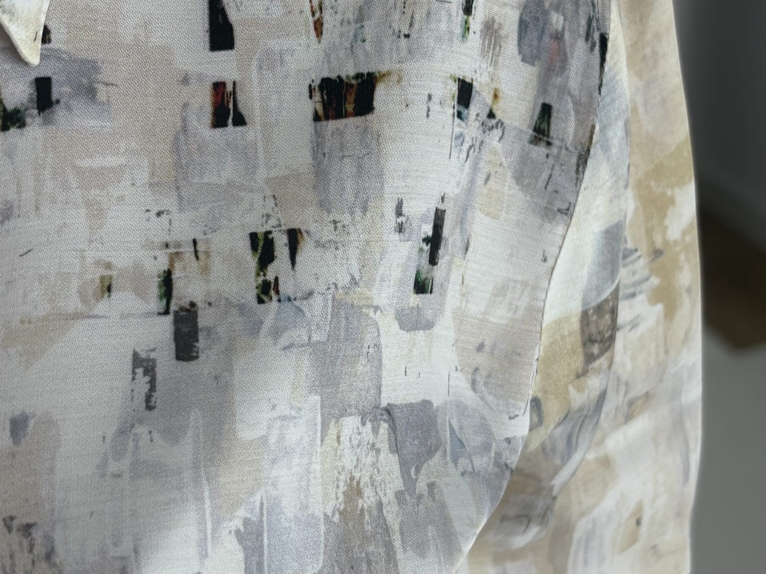 Bluzka z wiskozy z abstrakcyjnym nadrukiem w kolorach beżu, niebieskiego, granatu.
