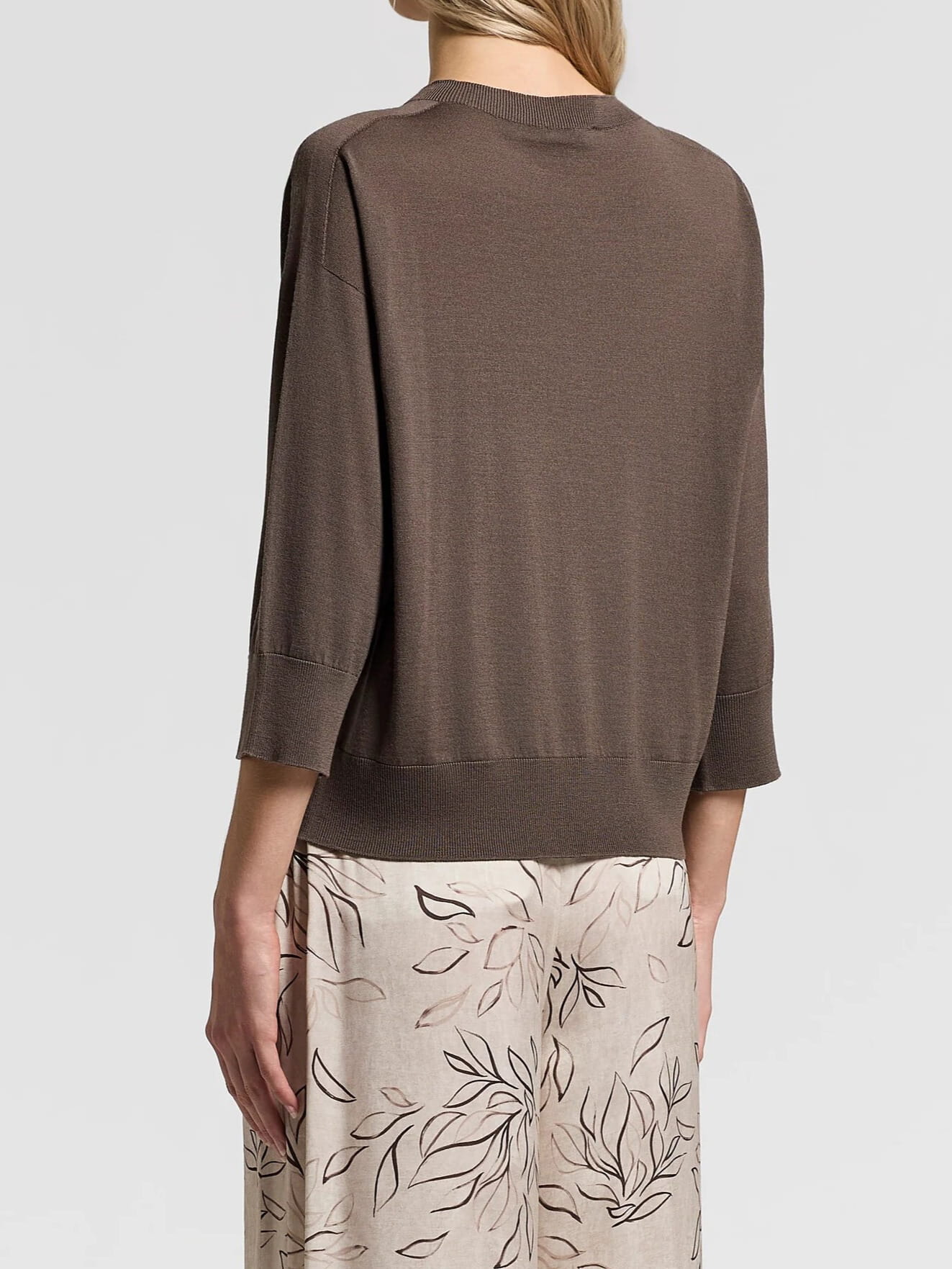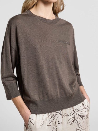 Delikatny sweterek z czystej wełny z merynosów o gładkim splocie podkreśla jego lekkość i luksusowy wygląd.